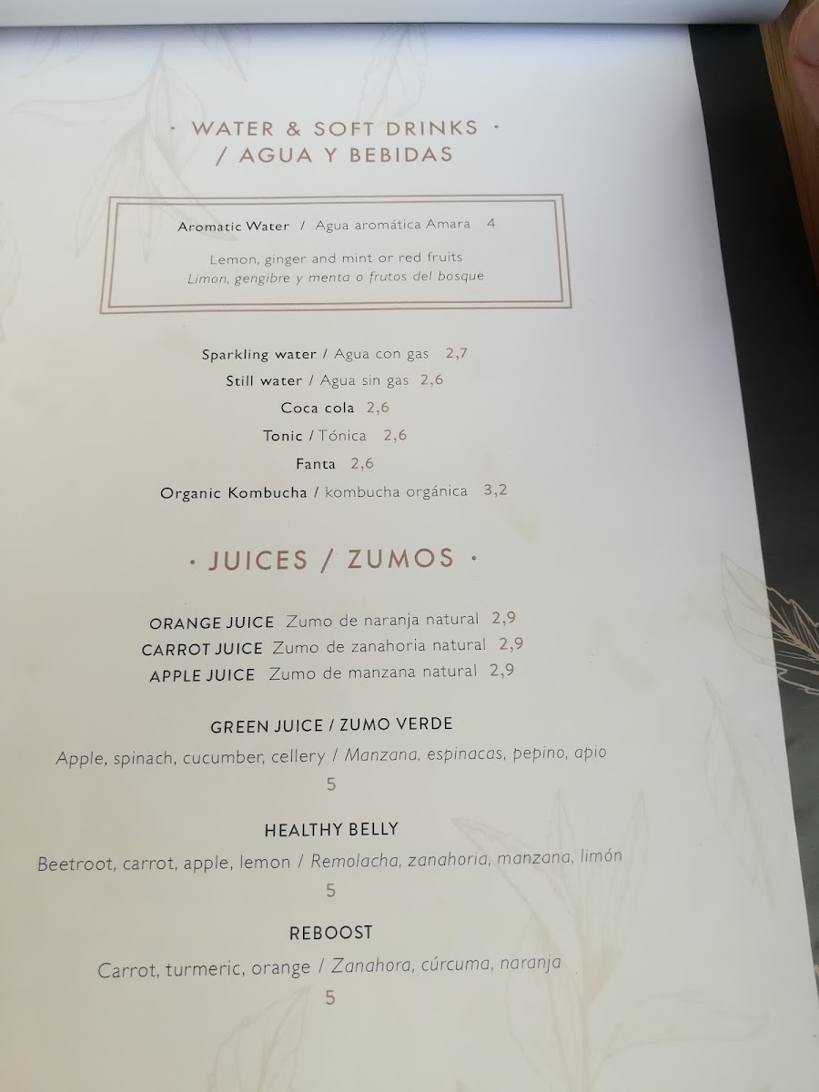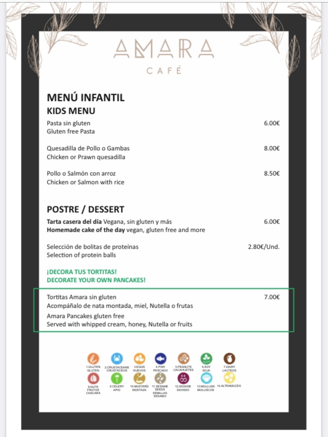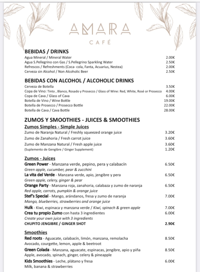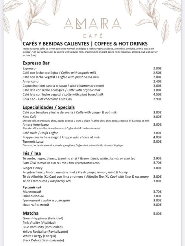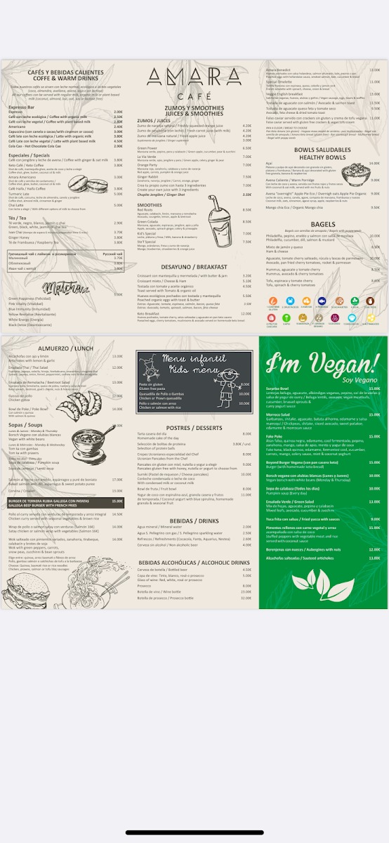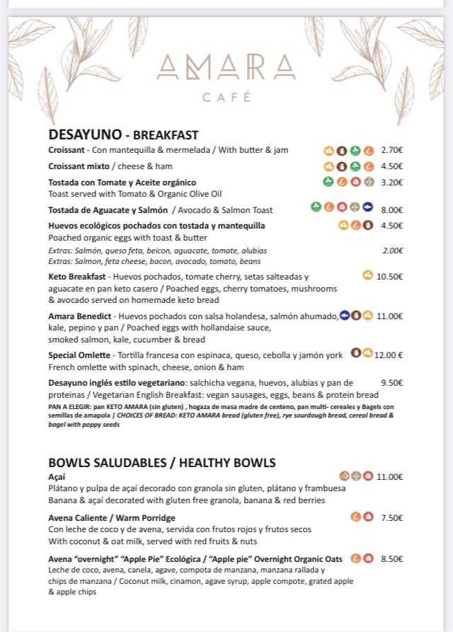 The food selection includes several egg-based dishes such as Amara Benedict with poached eggs, hollandaise sauce, salmon, cucumber, and kale chips, as well as a special omelet containing eggs, ham, cheese, spinach, and onion served with bread and salad. There are also several tostadas, including the Tostada Amara with bread, avocado, and scrambled eggs, and a variant with avocado and salmon. For those seeking low-carbohydrate options, the Keto Breakfast includes keto bread, poached eggs, avocado, and tomato. The menu also offers vegan options like vegan meatballs paired with eggs and other breakfast staples.